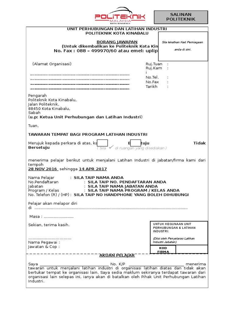 Contoh borang jawapan tawaran politeknik. Semoga contoh surat tawaran ini dapat memberi gambaran serba sedikit kepada anda. Salinan keputusan spm yang telah disahkan 7. Semakan keputusan permohonan rayuan dan cetakan surat tawaran bagi lepasan spm sijil politeknik kolej komuniti ikm skm ip perda tech ke program pra diploma diploma politeknik malaysia. Jika didapati bercanggah jabatan pendidikan politeknik dan kolej komuniti berhak tarik balik tawaran atau tamatkan terus pengajian anda.
