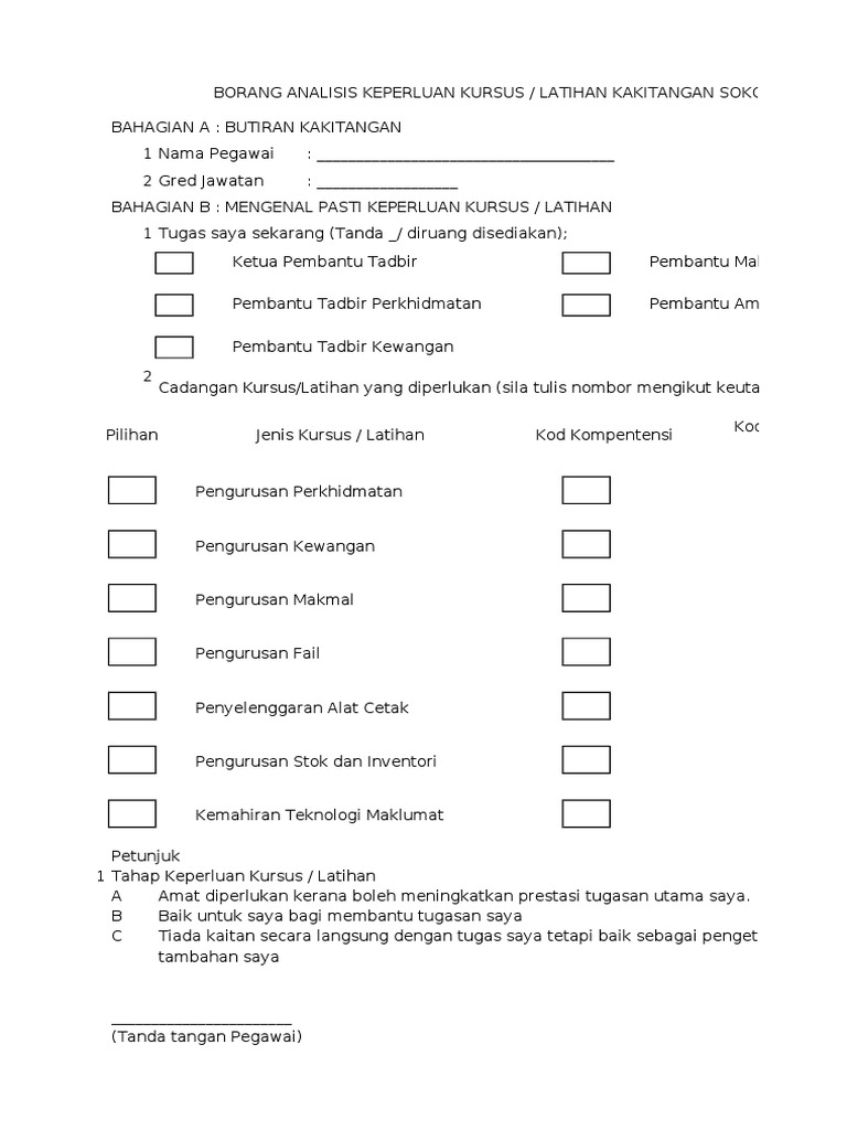 Contoh borang soal selidik analisis keperluan latihan. Sangat perlu sp 4. Anda bisa mendownload atau mencetak gambar atau foto contoh borang soal. Sangat tidak perlu stp a. Borang soal selidik tna analisis keperluan latihan borang soal selidik ini adalah untuk mengkaji keperluan latihan yang diperlukan oleh pegawai dan kakitangan.
