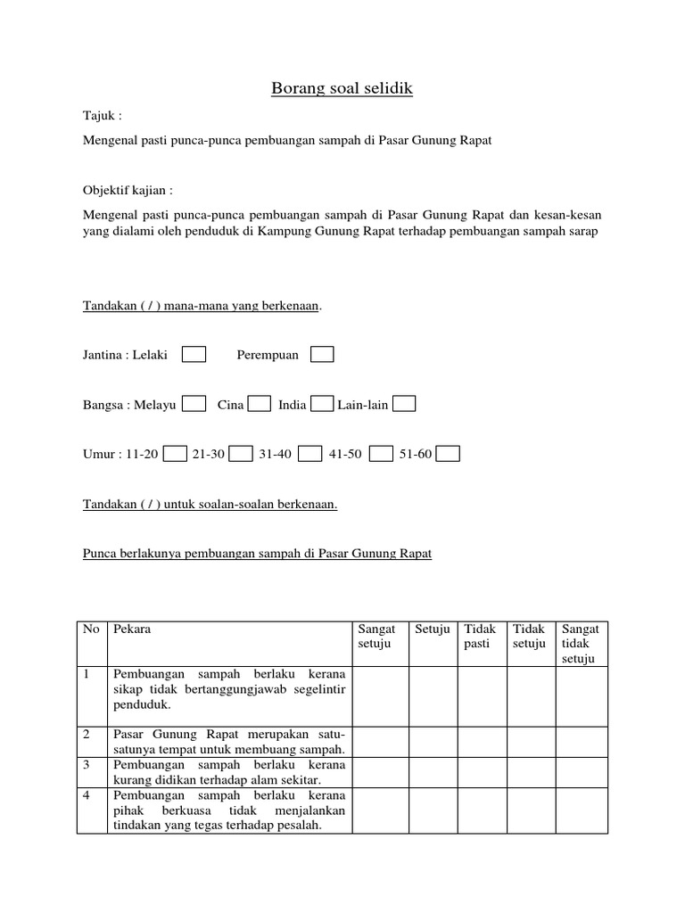 Contoh borang soal selidik geografi pembuangan sisa domestik. Amalan atau tabiat pembuangan sisa domestik penduduk tempatan penduduk tempatan tidak mengambil perhatian atas pembuangan sisa domestik yang semakin berleluasa. Kerja kursus geografi smkpp9 2 2011 borang soal selidik nama pelajar. Jawapan schem module chemistry waja chapter 1 rate of reaction answer activity 1 speed product reactants products 2 1. Tandakan x udara tercemar.