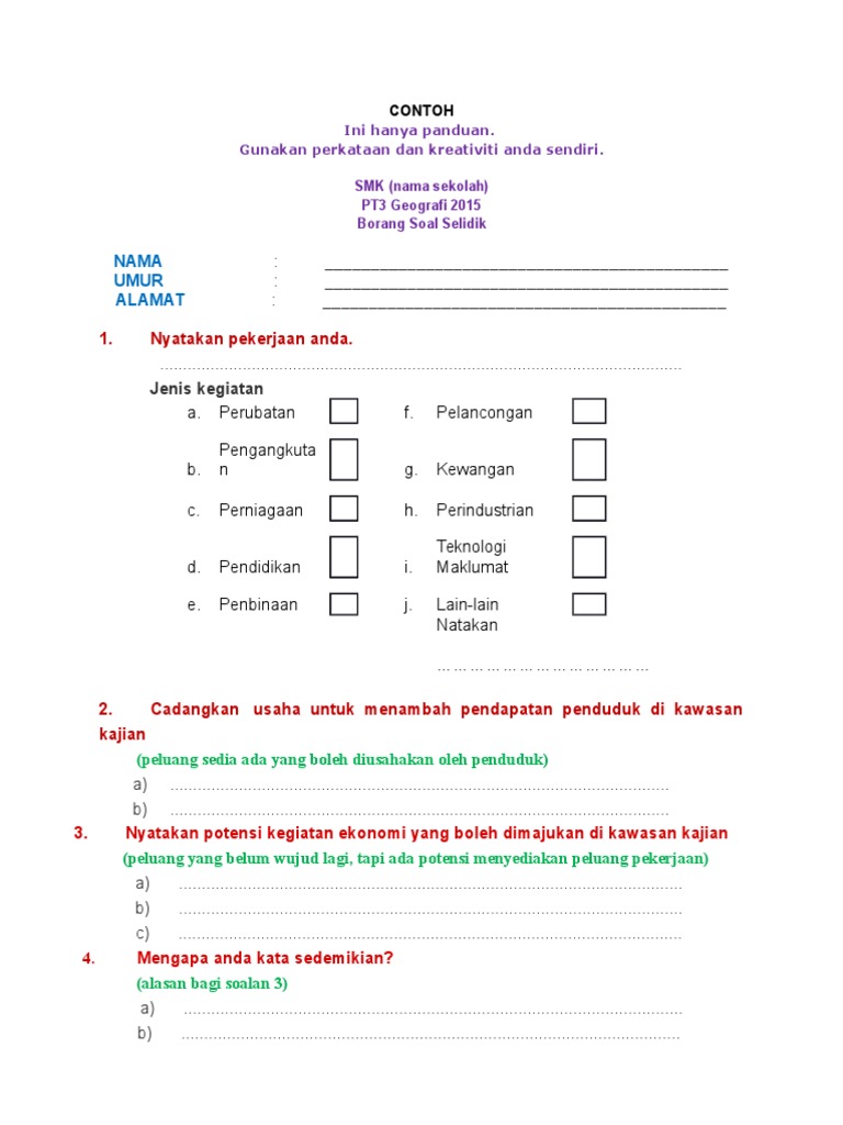 Contoh borang soal selidik geografi tentang kegiatan ekonomi. Contoh dan cara buat borang soal selidik tugasan kajian lapangan geografi pt3 tahun 2019. Borang soal selidik tugasan geografi pt3 2015 calon pt3 tahun 2015 dikehendaki melaksanakan jenis tugasan iaitu kajian lapangan tentang pekerjaan penduduk dalam pelbagai kegiatan ekonomi di sekitar tempat tinggal atau sekolah calon. Sila klik satu persatu gambar di bawah sekali ini untuk paparan yang lebih jelas. Jelah january 27 2012 at 4 37 pm.