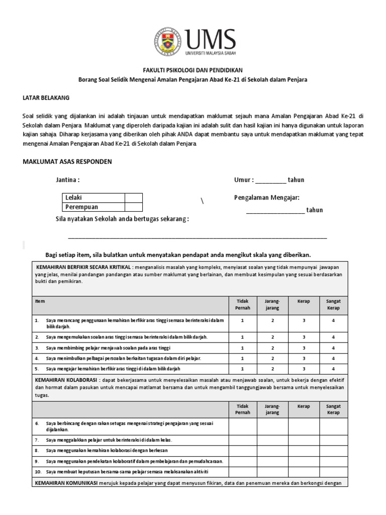 Contoh borang soal selidik inovasi. Manakala bahagian b mengandungi soalan soalan yang berkaitan dengan tajuk kajian ini. Borang soal selidik borang soal selidik ini dikemukakan untuk mendapatkan maklum balas dan menilai persepsi masyarakat melayu di daerah pengkalan hulu perak terhadap haiwan fasiq. Jika anda mencari contoh borang soal selidik inovasi maka anda berada di tempat yang tepat blog contohkri memiliki banyak koleksi gambar seperti contoh borang soal selidik inovasi gambar ini tersedia dalam format jpg png gif. Borang ini terdiri daripada empat bahagian a b c dan d yang perlu dijawab oleh responden kajian.