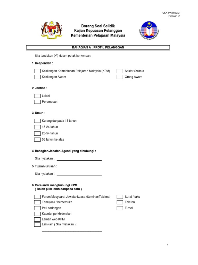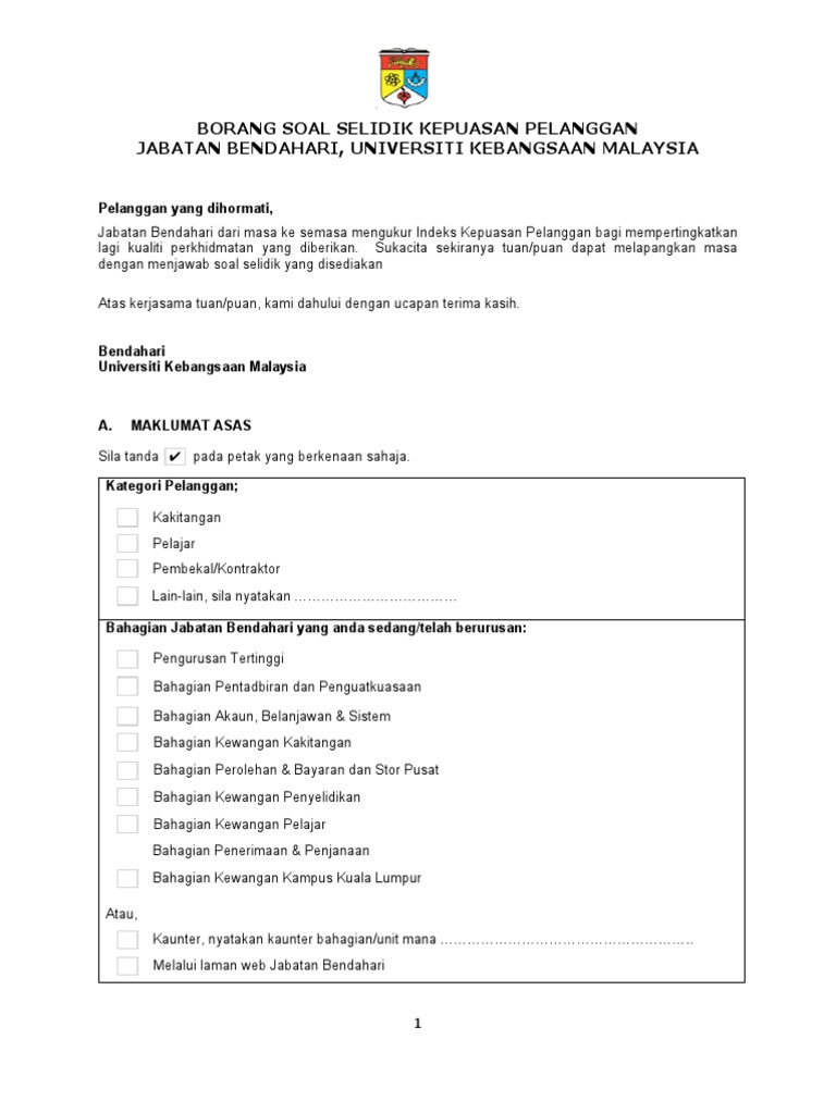 Untuk menjadi sebuah institusi pengajian tinggi yang terulung kepuasan pelanggan terhadap kualiti pendidikan di institusi tersebut harusnya. Borang soal selidik kajian kepuasan pelanggan feedback form customer satisfaction survey soal selidik ini bertujuan mendapatkan maklumbalas pelanggan terhadap perkhidmatan sistem komunikasi telefon e mel yang disediakan oleh agensi regulatori farmasi negara npra. Borang soal selidik kajian kepuasan pelanggan terhadap perkhidmatan kaunter unit hasil utama hospital sungai buloh para pelanggan yang dihormati. Maklumat asas responden.