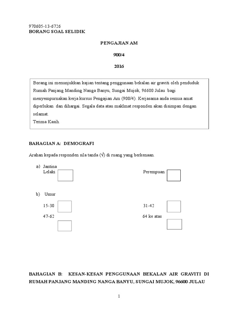 Pbs pngjian am faz word fazrul. Borang soal selidik ini mengandungi 13 soalan yang meliputi pelbagai bentuk soalan untuk melihat aktiviti aktiviti respondan yang berkaitan dengan penggunaan air domestik. Contoh borang soal selidik kepuasan kerja contoh borang soal selidik geografi pt3 2017 contoh borang soal selidik pembelian online contoh. Anda bisa mendownload atau mencetak gambar atau foto contoh borang soal selidik gaya hidup.