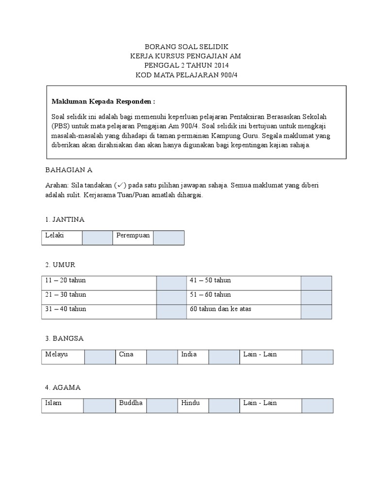 Contoh borang soal selidik pengajian am integrasi dan perpaduan. Sekolah menengah kebangsaan borang soal selidik kerja kursus pengajian am penggal 2 tahun 2014 makluman kepada responden soal selidik ini adalah bagi memenuhi keperluan penilaian berasaskan sekolah pbs untuk mata pelajaran pengajian am. Soal selidik ini bertujuan untuk mendapatkan maklumat tentang satu tinjauan tentang peranan permainan catur dalam mewujudkan semangat kekeluargaan dalam kalangan pelajar asrama smk tambunan maklumat yang diperoleh daripada kajian ini adalah sulit dan hasil kajian ini digunakan untuk laporan kerja projek subjek pengajian am 900 4. Kaedah kajian yang digunakan ialah kaedah pemerhatian temubual soal selidik kepustakaan dan rujukan atas talian internet. Inilah pembahasan selengkapnya mengenai contoh borang soal selidik pengajian am integrasi dan perpaduan.