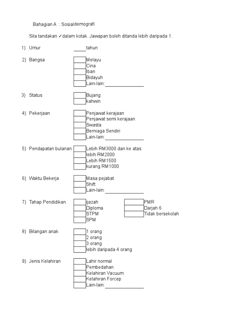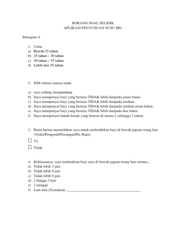 Contoh borang soal selidik penyusuan susu ibu. Borang soal selidik kepada tuan tuan yang dihormati adalah dimaklumkan bahawa saya sedang mengikuti progran ijazah sarjana pengurusan dari universiti malaya. Kajian ini menggunakan borang soal selidik untuk diisi oleh responden. Susu peringkat ini mengandungi lebih banyak lemak. Terlibat dengan penyusuan susu ibu seperti ibu bapa dan anak.