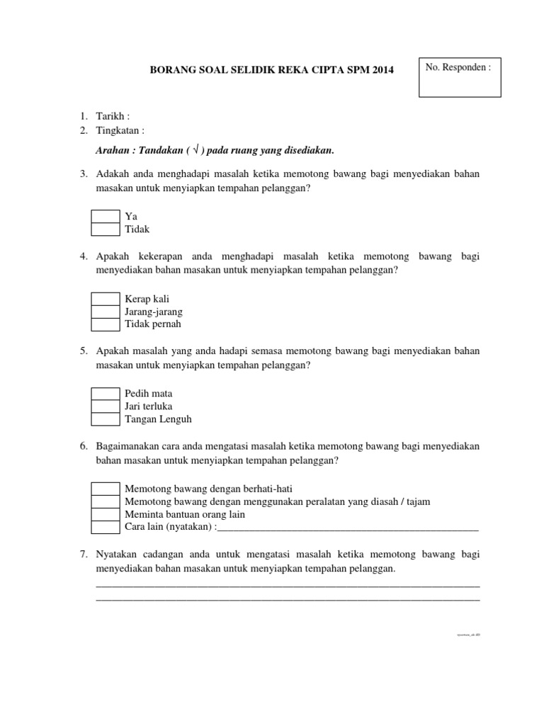Beliau tidak boleh menghidu serbuk kapur kerana ia boleh menyebabkan batuk dan seterusnya mengalami kesukaran bernafas. Adakah anda mengambil masa yang lama untuk menghantar gas memasak ke rumah pelanggan anda ya tidak 3. Related posts to contoh borang soal selidik reka cipta contoh borang soal selidik reka cipta 2018 09 15t18 27 00 07 00 rating. Contoh borang soal selidik kerjakursus rekacipta pemungutan smk saribas responden.