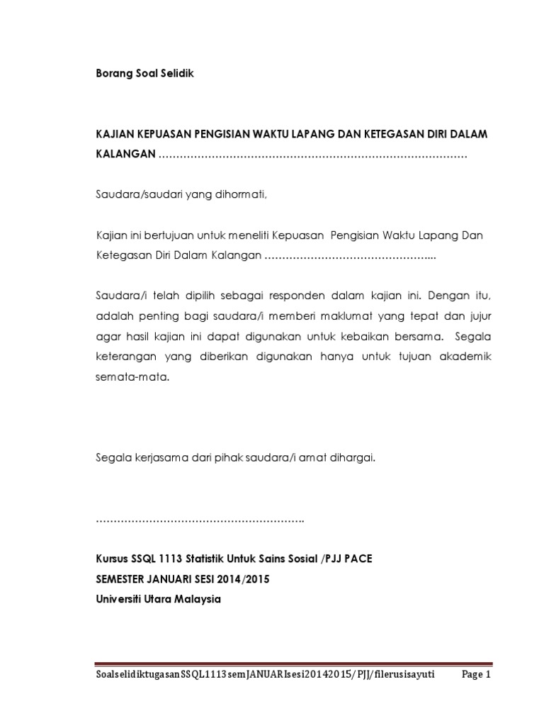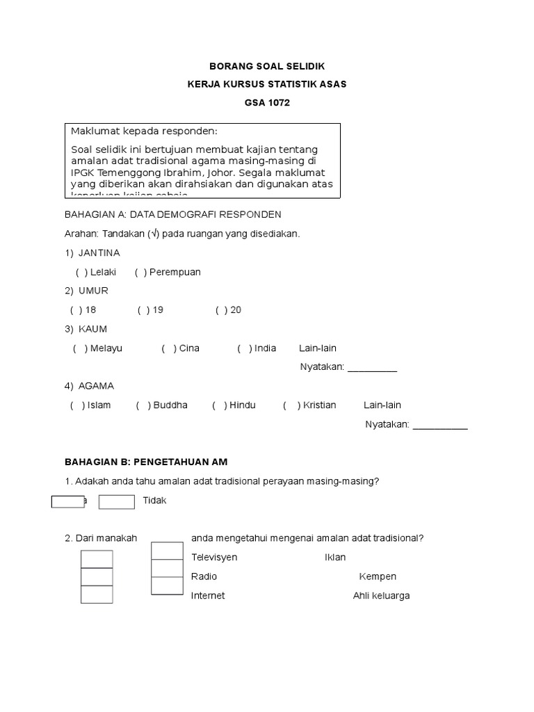 Contoh borang soal selidik statistik. Mereka juga dipanggil sebagai soal selidik tertutup. Borang soal selidik statistik perpustakaan ini mempunyai enam belas 16 muka surat termasuk keterangan di muka surat ini. Borang soal selidik kepada tuan tuan yang dihormati adalah dimaklumkan bahawa saya sedang mengikuti progran ijazah sarjana pengurusan dari universiti malaya. Bulatkan skala mengikut tahap persetujuan anda penyataan.