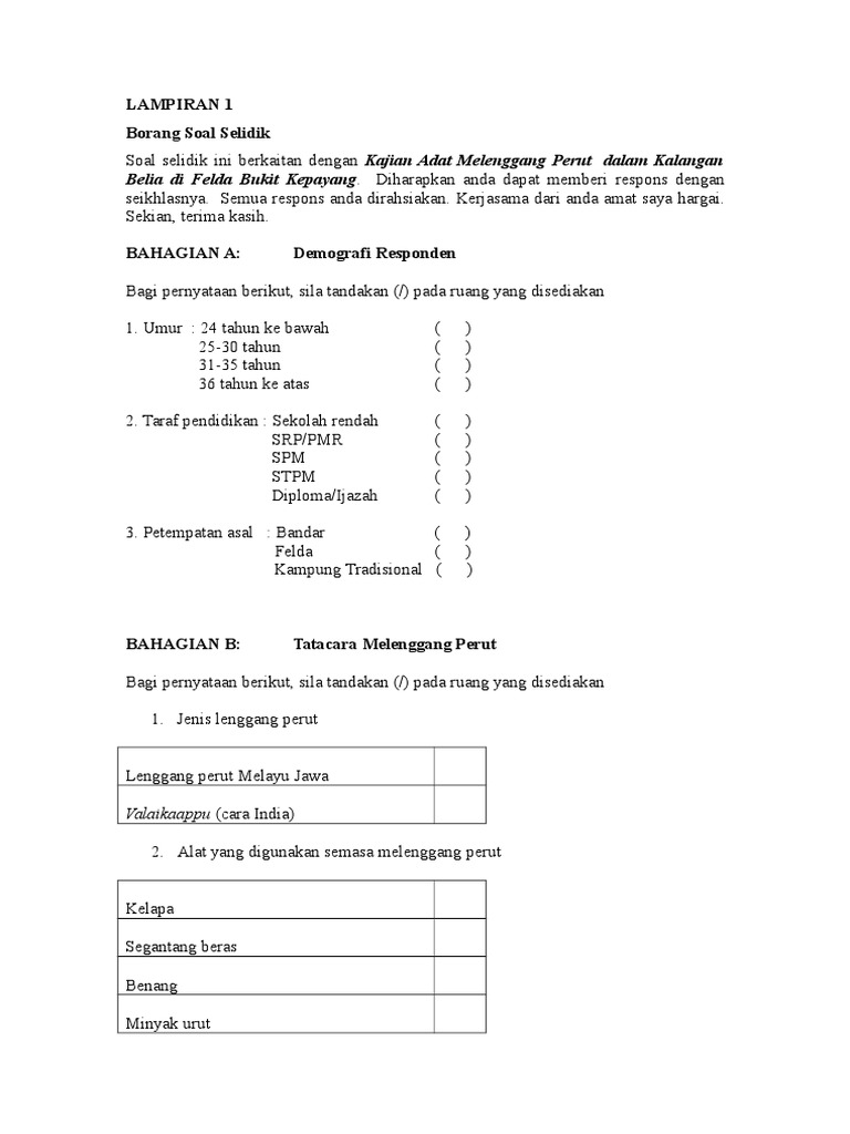 Soal selidik untuk mengenal pasti adat perkahwinan masyarakat melayu dan kesan kesan adat perkahwinan masyarakat melayu yang diamalkan oleh penduduk tempatan di chemor perak. Kepada respondan yang dihormati diharapkan kerjasama anda agar dapat meluangkan sedikit masa untuk menjawab soalan soalan ini. Manfaat cara minum efek samping dll. Justeru sukacita tuan puan dipohon untuk melengkapkan semua butiran seperti yang tertera.