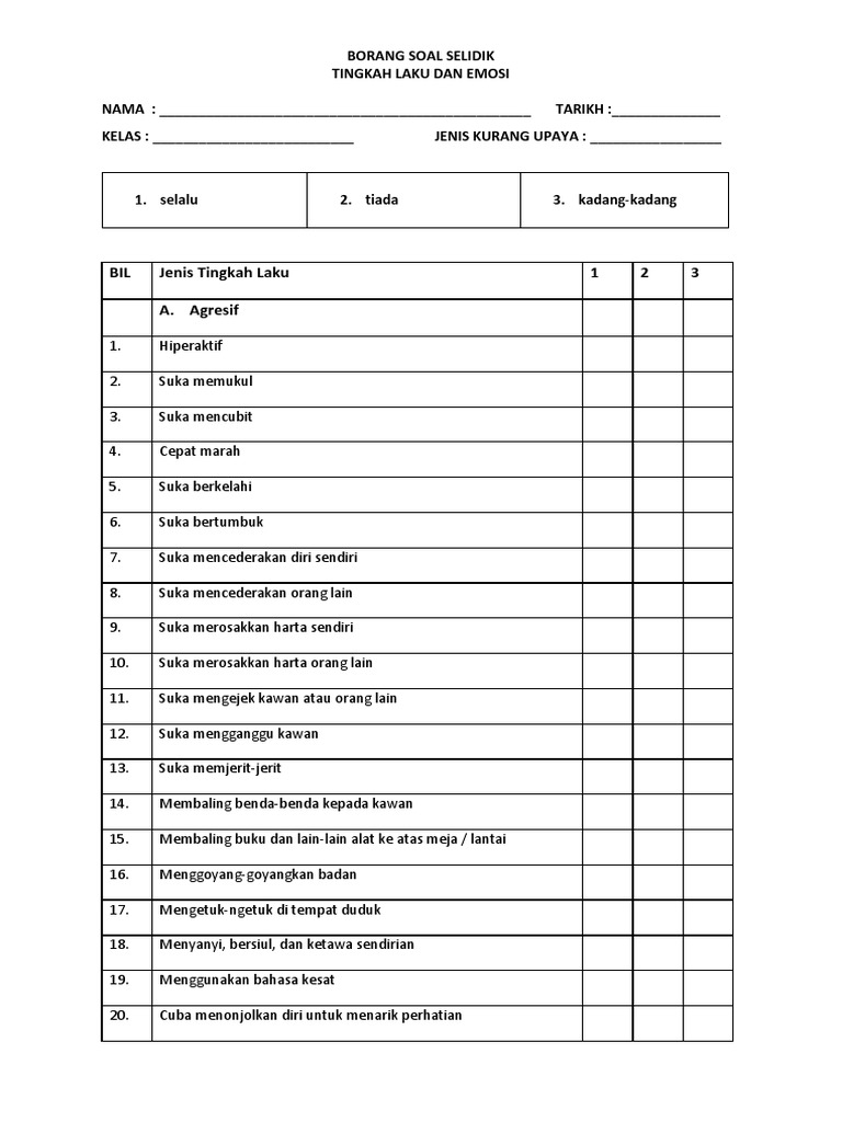 04 selalu rosakkan harta benda sendiri orang lain 05 selalu. Borang soal selidik tersebut dibahagikan kepada dua bahagian. Related posts to contoh borang soal selidik tingkah laku murid contoh borang soal selidik tingkah laku murid 2017 03 10t04 45 00 08 00 rating. Ianya terdiri daripada tingkah laku agresif seperti hiperaktif suka memukul mencubit membaling benda dan sebagainya.
