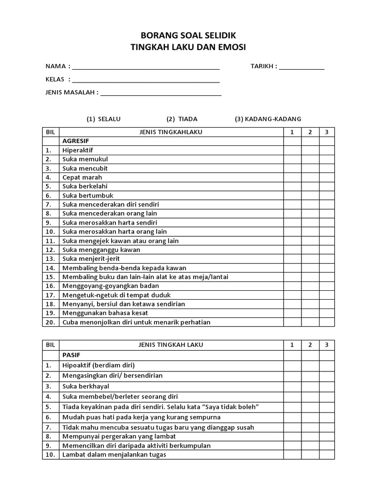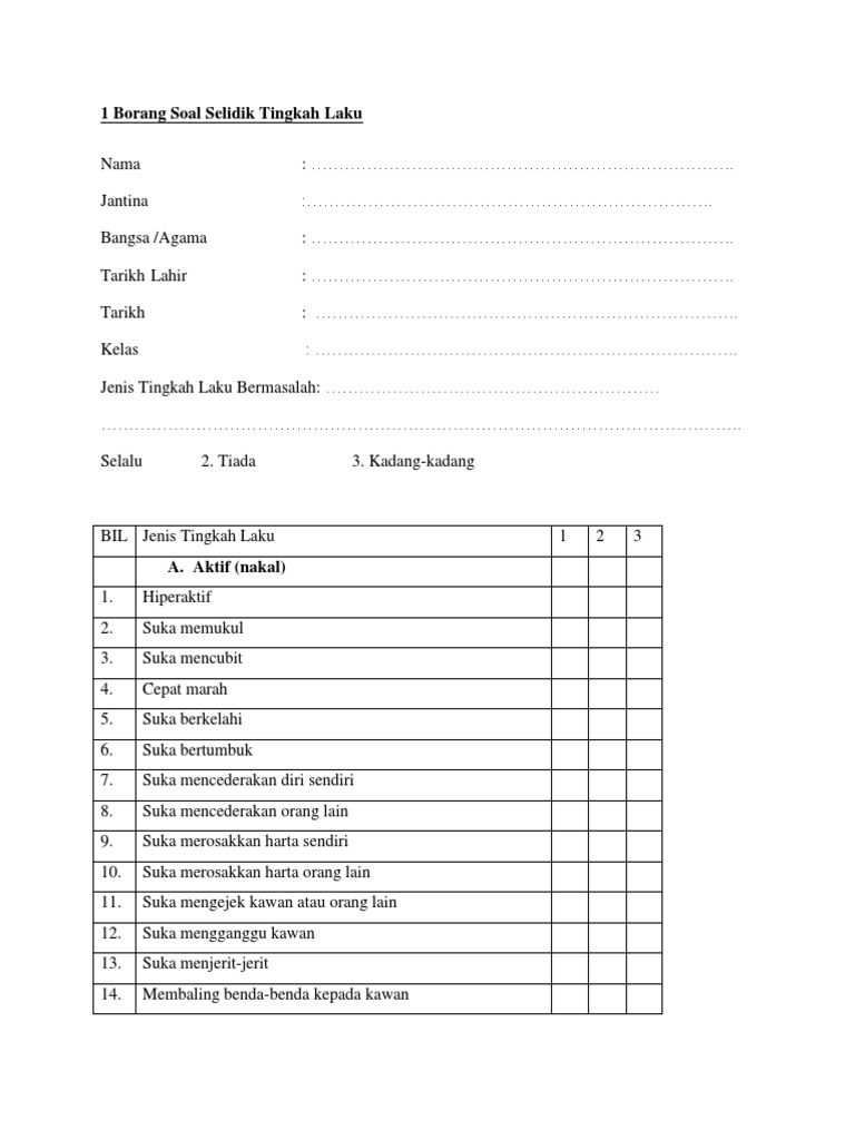 Contoh borang soal selidik tingkah laku. 1 kaedah soal selidik samb 1 6 2 soal selidik diserahkan secara pos kiriman kelebihan dapat mengukur lebih banyak subjek menjimatkan masa belanja dan tenaga kelemahan sukar mendapatkan kerjasama subjek menjawab dengan lengkap serta memulangkan kembali soalselidik. Bahagian pertama pada soal selidik bertujuan untuk mendapatkan beberapa maklumat peribadi mereka. Sikap dan tingkah laku remaja terhadap pembelajaran di sekolah. Laku tingkah laku yang sering dilakukan dalam kalangan mereka sendiri adalah merupakan.