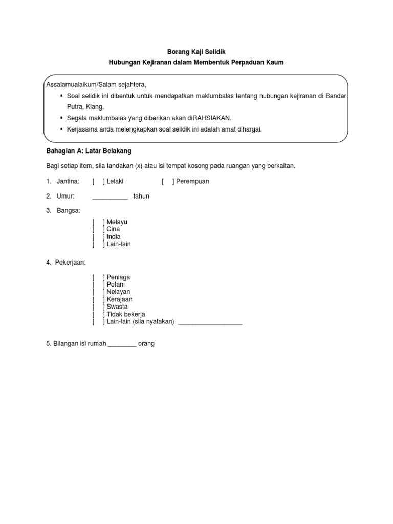 Hubungan etnik borang soal selidik tentang perpaduan kaum. Untuk perpaduan dan integrasi kaum. Related posts to contoh borang soal selidik perpaduan kaum contoh borang soal selidik perpaduan kaum 2017 12 11t21 11 00 08 00 rating. Soalan yang dikemukakan terdiri daripada dua bahagian iaitu bahagian a dan b. Academia edu is a platform for academics to share research papers.