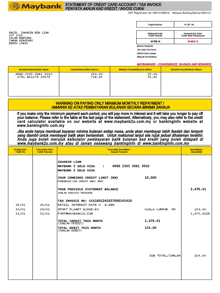 Kepada anda penyata bulanan kad kredit yang mencatatkan butir butir pembelian anda termasuk pendahuluan wang tunai jika ada jumlah baki belum jelas jumlah bayaran minimum dan tarikh akhir untuk membuat pembayaran. Pemegang manamana kad kadkad kredit maybank boleh memohon untuk memindah baki belum jelas termasuk jumlah pokok faedah teraku caj kewangan dan caj lain seperti yang ditunjukkan dalam penyata penyatapenyata akaun terkini yang berkenaan baki belum jelas daripada akaun akaunakaun manamana kad lain yang dipegang oleh mereka kecuali. Selain tu kalau korang guna kad kredit yang ditawarkan oleh bank yang ada mobile banking app macam cimb clicks dan maybank2u lagi mudah urusan korang. Seperkara lagi anda boleh semak promosi yang ditawarkan oleh pihak bank.