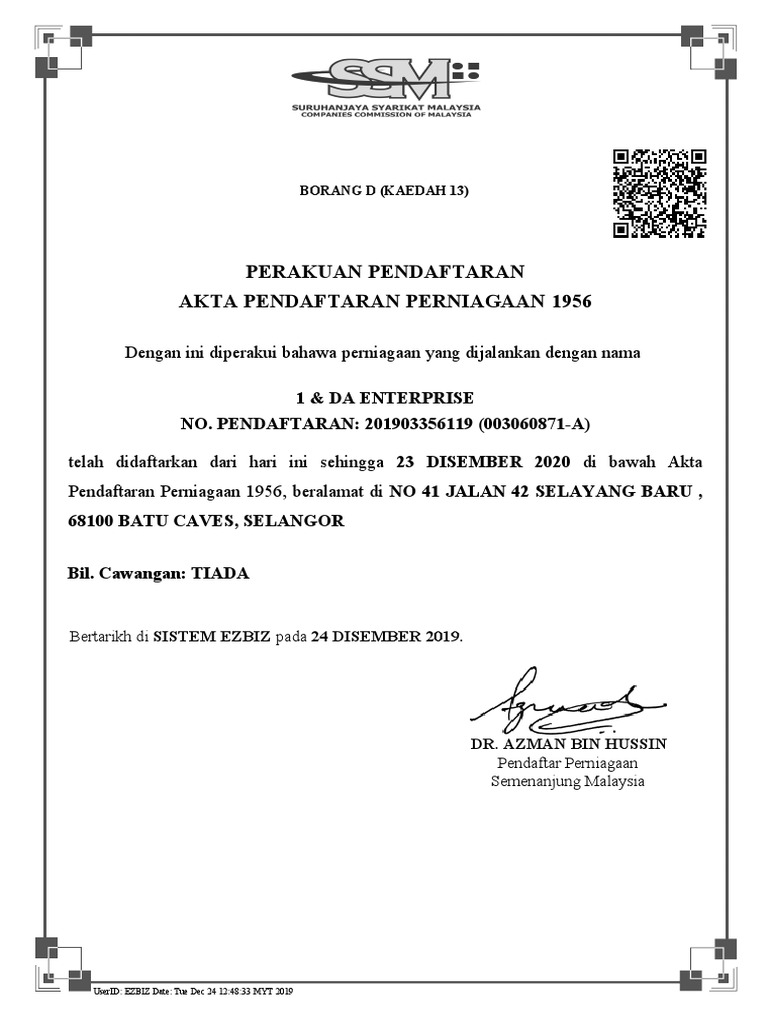 Imbasuntuk pengesahan userid ruhailamohamed date fridec0211 492016 printingdate 02 12 2016 maklumatperniagaaninidijanaolehperkhidmatanmydatassm maklumatadalahpada02. Pendaftaran jm0360837 a dengan ini diperakui bahawa pemiagaan yang dijalankan dengan nama sukhaijat enterprise telah didaftarkan dari hari ini sehingga 1 ogos 2017 menurut peruntukan. Perubahan perubahan dalam perniagaan hendaklah dilaporkan kepada. Salinan perakuan pendaftaran perniagaan borang d kaedah 13 di bawah akta pendaftaran perniagaan 1956 ii.