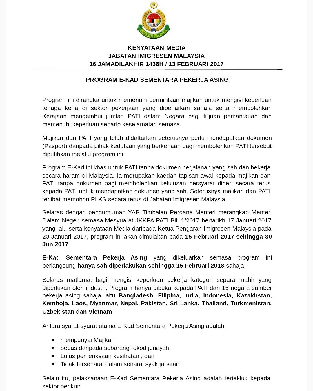 Ketua pengarah jabatan imigresen malaysia datuk khairul dzaimee daud berkata berikutan itu pekerja asing dikehendaki membawa pasport mereka buat masa ini. Pekerja asing yang dikeluarkan pl ks turut dibekalkan dengan i kad.