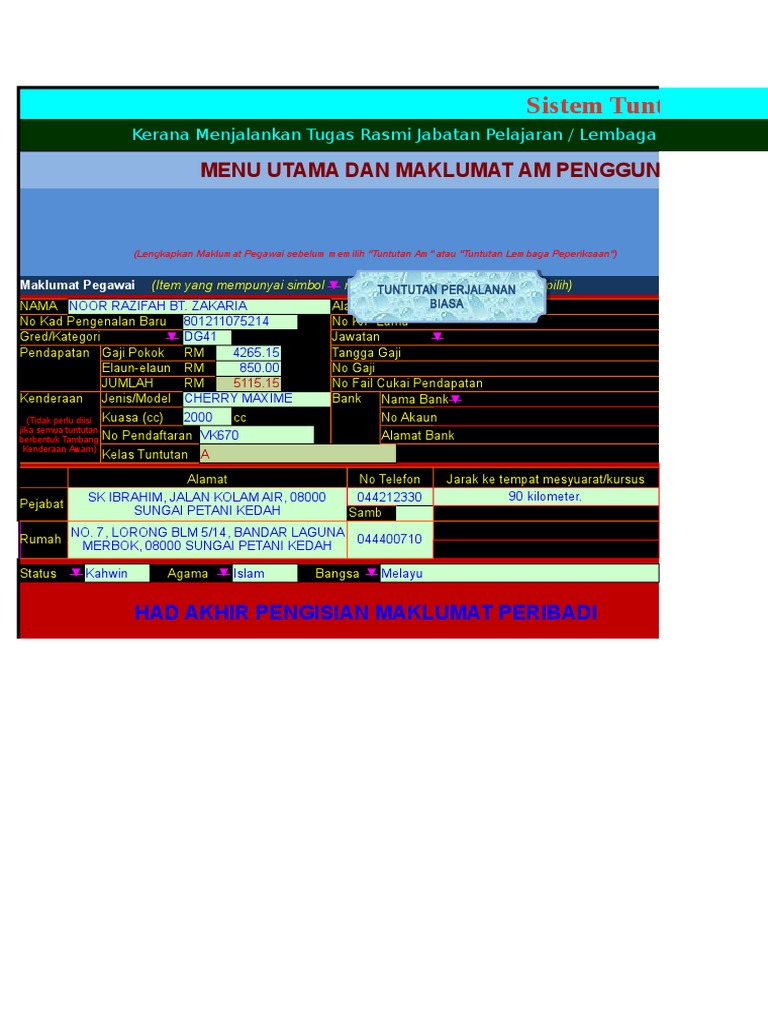Selain mengisi borang tuntutan dalam excel ini pegawai pendidikan perlu menyediakan lampiran seperti berikut. Pekeliling perbendaharaan malaysia wp1 4 m s 4 37 elaun dan bayaran anggota perkhidmatan awam wp1 4 kadar dan syarat tuntutan elaun kemudahan dan bayaran kepada pegawai perkhidmatan awam kerana menjalankan tugas rasmi tidak termasuk. Perjalanan pada tarikh tarikh tersebut adalah benar dan di atas urusan universiti.